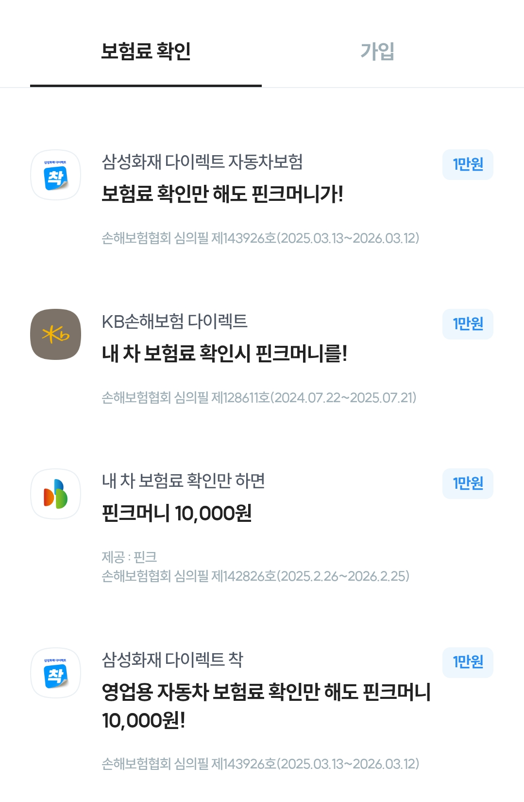 자동차보험 견적 이벤트 - 핀크 얼마전까지만 해도 자동차 보험 가입//갱신 관련 견적이벤트를 제공하는 곳이 다수가 있었고서로 경쟁하는 시장이었기 때문에 이곳 저곳 비교하는 경우도 있었지만이제는 '핀크' 로 통일되었다.여러 플랫폼에서 동일한 보험료 견적 이벤트를 하지만핀크가 사은품으로 얻을 수 있는 금액이 가장 크다는 것을 알 수 있다.이제는 메이져 3사 (삼성화재, KB, DB)를 제외하고는 이벤트조차 안 하지만토스에서 '캐롯손해보험' 이 있으니 잘 활용할 수 있을 것이다.단, 삼성화재의 경우 이벤트 참여 365일이 지나야 한다는 점을 명심하자. 다른 보험사의 경우는 만기 한달전에는 견적 이벤트 참여가 가능하지만삼성화재는 1년이 지나야지만 가능하다. 플랫폼삼성화재KB손해보험DB손해보험캐롯손해보험핀크100001000010000-네이버 페.. 이런 저런 이야기 2025.06.15