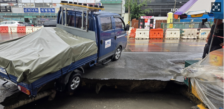 부산시 사상구 감전동 땅꺼짐 위치8월 12일 오전 11시경부산시 사상구 감전동의 한 도로에서 땅꺼짐이 발생하였습니다. 땅꺼짐의 크기는가로 5m, 세로1m, 깊이 1m 의 대형크기로사고 발생시 주행중이던1톤 트럭의 뒷바퀴가 빠지는 사고가 발생하였습니다. 해당 운전자는 자력으로 탈출하였으며담당 구청은 호우 및 부실공사로 원인을 추정하고 있습니다. 땅꺼짐이 발생한 도로는현장 사진상의 주변 상가로 미루어부산시 사상구 감전동, 새벽로로 추정되며부산 '사상하단선' 공사 바로 윗 부분으로 추정됩니다. 해당 지하철 공사로 인해지난 3년간 15여개의 땅꺼짐이 발생했다고 알려져 있습니다.